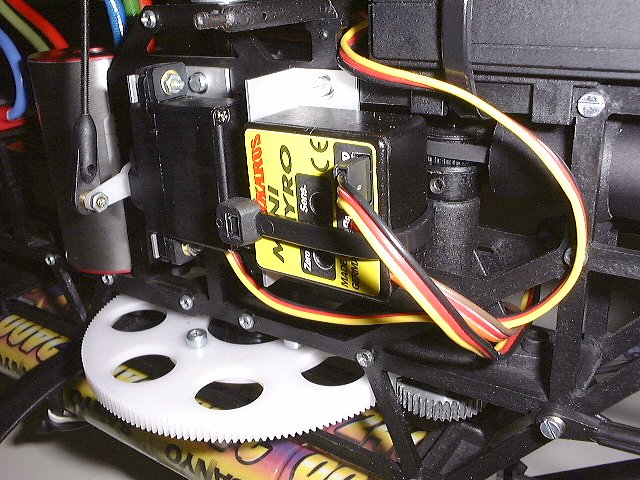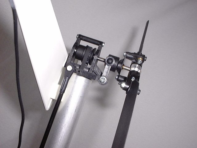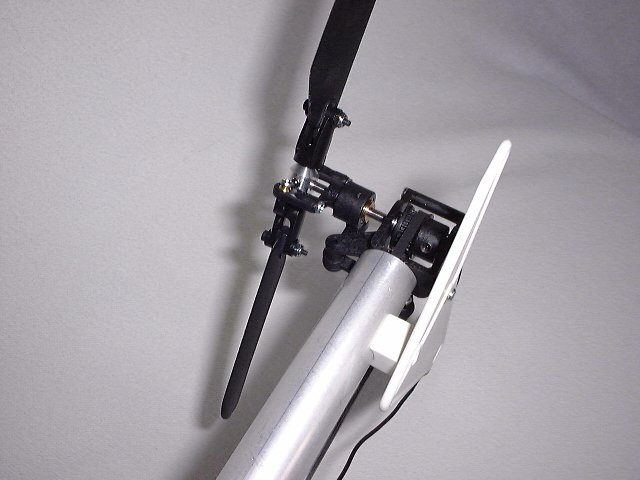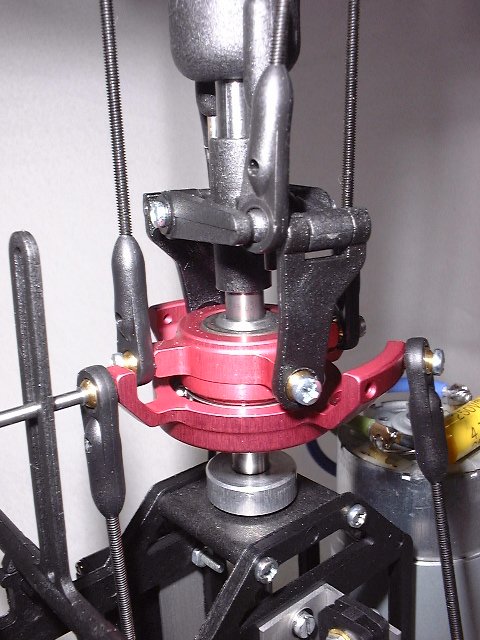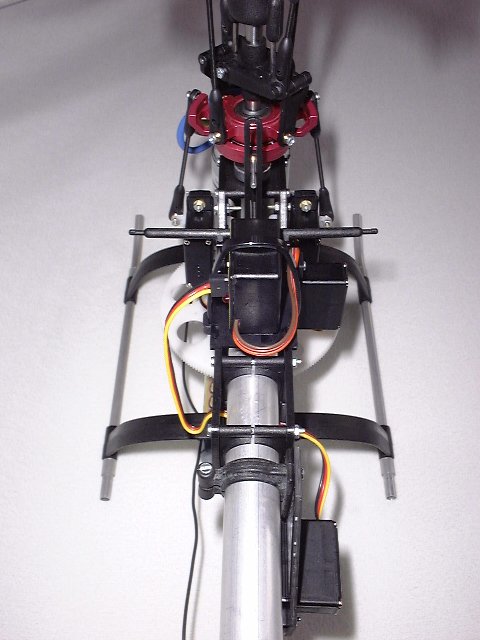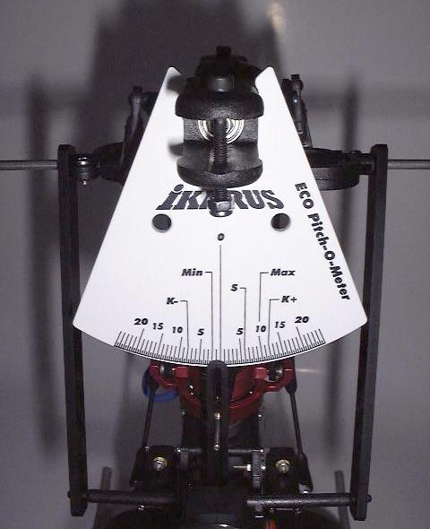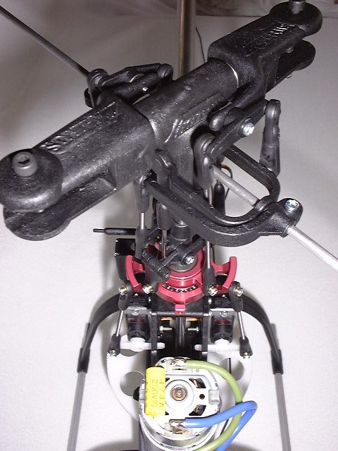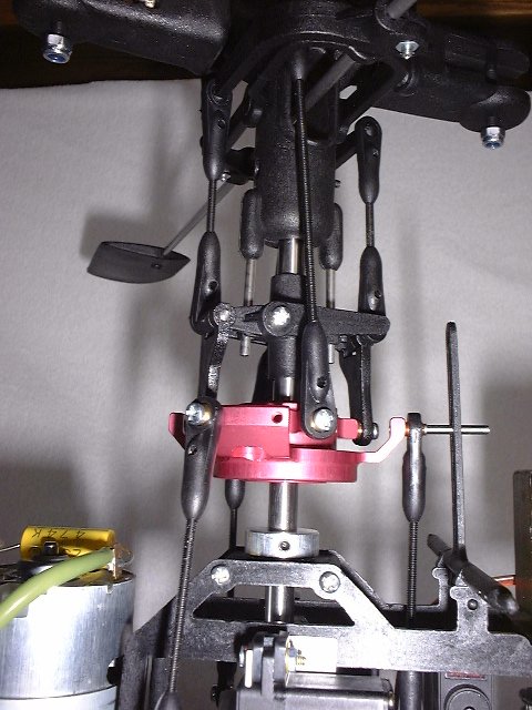 Ausserdem ist zu beachten, dass sich die Position der Alu-Taumelscheibe ganz unten befindet - also Pitch/Steuerknüppel auf Minimum (Motor aus)! Der Hauptrotorblatt-Pitch liegt dann bei -1°.