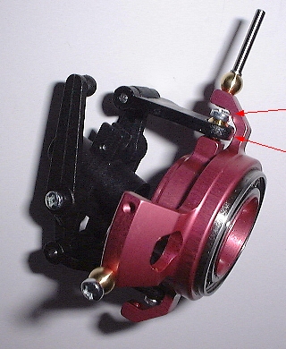 Wie man erkennen kann, stössen die Schrauben am Arm der Taumelscheibe (Pfeile; bitte auf das Bild klicken). Somit lässt sich das obere Teil nicht um 360° drehen. Ich habe die Schrauben und Kugeln genommen, die mit der Alu-Taumelscheibe mitgeliefert wurden. Was ist falsch!?? |