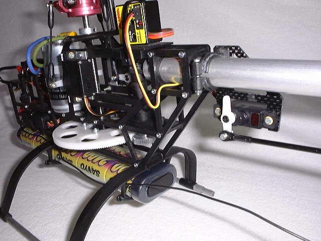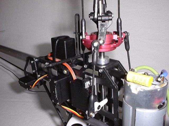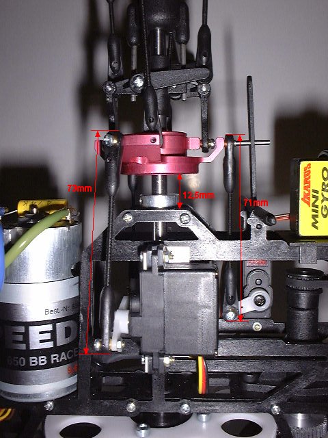 Im Bild kann man ersehen, wie es bei meinem Heli ausschaut. Man sollte berücksichten, das ich die Alu-Taumelscheibe einsetze und ich nicht weis ob die Verhältnisse mit der Kunststoff-Taumelscheibe gleich sind.