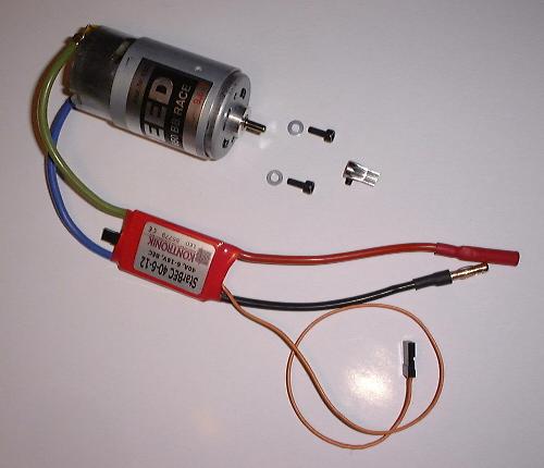 Zusammenstellung Elektromotor, Befestigungsschrauben und der 10er Ritzel. |